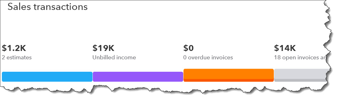 Your home base for checking on your outstanding cash, though, is the Sales page. Hover over Sales in the toolbar and select All sales. This page provides a visual display of the status of your invoices as they travel through QuickBooks Online. Colored bars represent the five stages in the process: Estimates, Unbilled income, Overdue invoices, Open invoices and credits, and Recently paid.